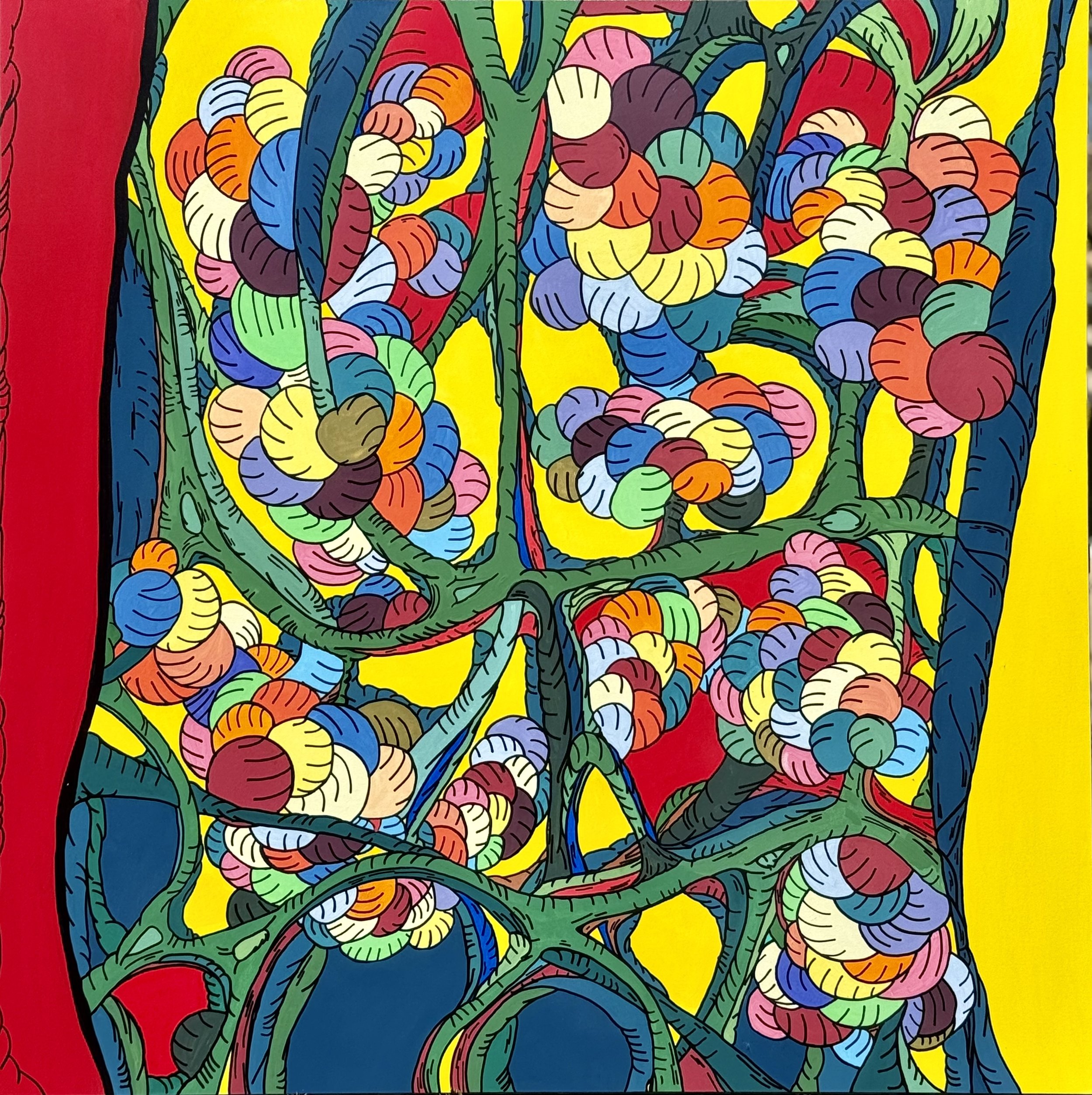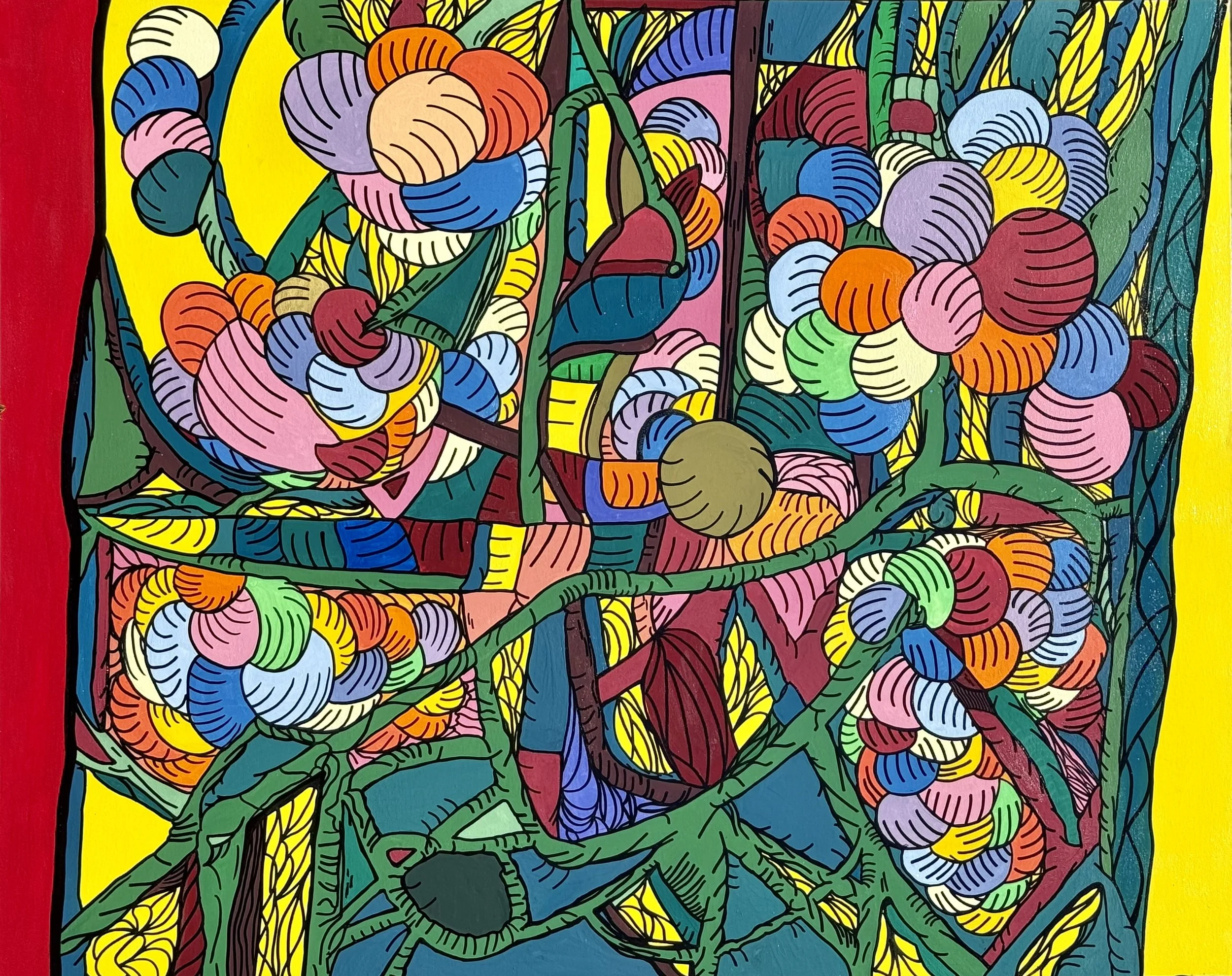 Au cœur du jaune solaire de la lumière, se tissent les veines d’un labyrinthe vivant et foisonnant, gorgé de floraisons joyeuses et entêtées.